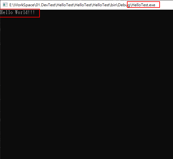 會出現執行畫面如下,會看到程式碼經過編譯後,會產生一個名為HelloTest.exe的執行檔,並執行秀出「Hello World!!!」字樣。