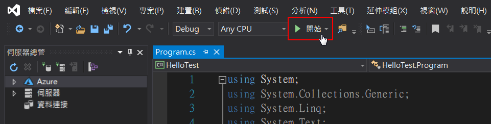因此在上述建立的「HelloTest」專案所產生的程式檔,點擊「Program.cs」檔案,打開後便是C#主要的程式碼,請在Main()方法加入下列兩段程式碼: