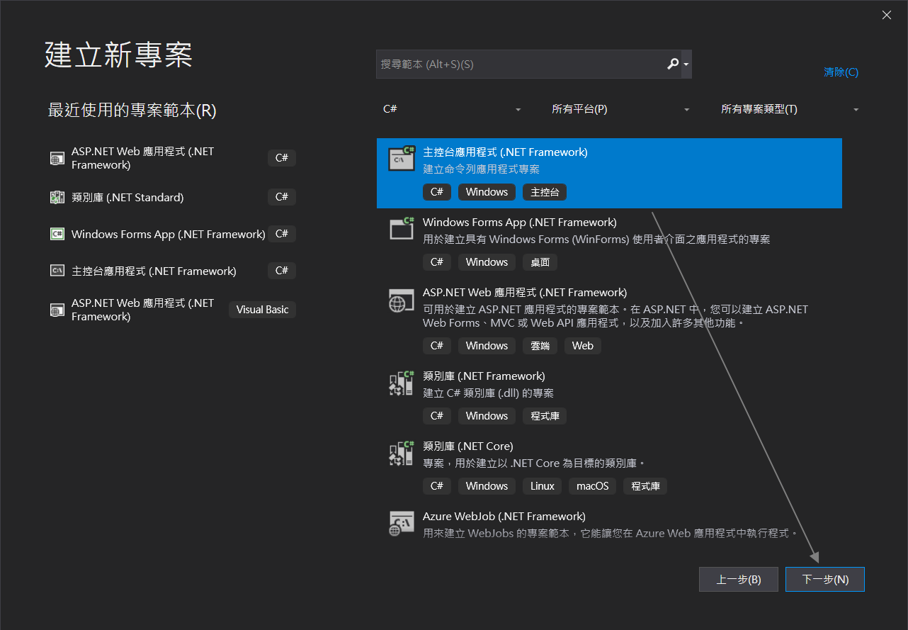 找尋「主控台應用程式(.NET Framework)」,點選後,並按「下一步」