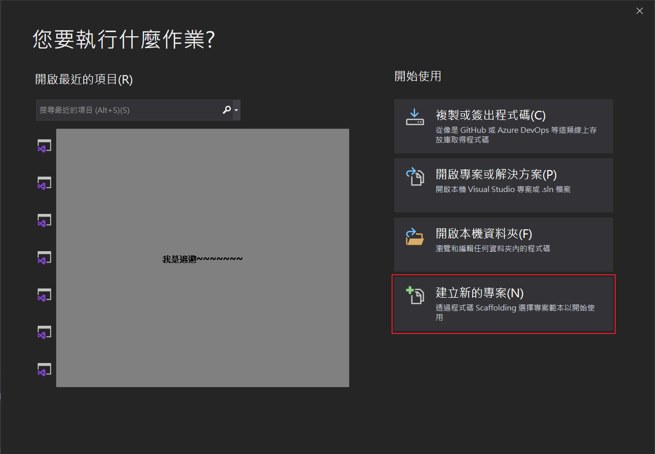 點擊「Visual Studio 2019」程式,當IDE完成啟動後,點選「建立新的專案」。