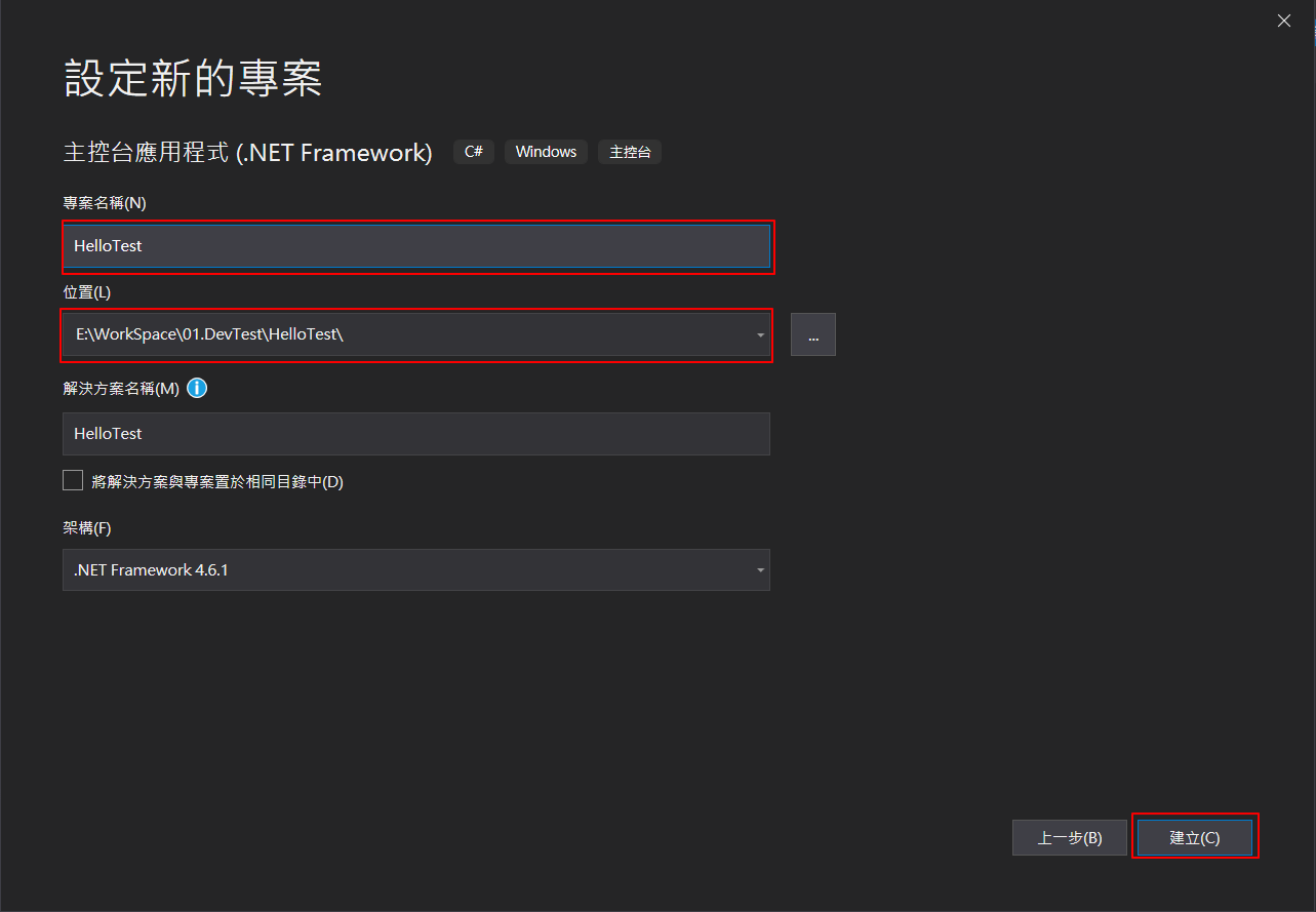 將「專案名稱」命名為「HelloTest」,如果自已有設定程式存放目錄位置的需求,可調整「位置」資訊,確認沒問題,按下「建立」,這樣新專案就建立完成了。